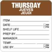 Daydots, a world leader in food safety solutions specializes in products that keep your customers and employees safe from food born illnesses and the prevention of accidents. Keep foods fresh and prevent spoilage by using Daydots Day of the Week Labels in the refrigerator or freezer that supports food rotation. Place warning signs in the back of the house where slips and falls are most likely to occur and posters to support good personal hygiene behavior. Stock your food service establishment with products that are designed to save you time and money.Features:-Dissolvable - Item Use by Thursday Label- 2in size labels|food labels|label|kitchen label| 2" Dissolvable Item Use By (E/S/F) Thu| Food Safety Solutions - food rotation labels| portion bags| color-coded systems| gloves| thermometers| hygiene| cleaning| and training| Labeling and Rotation| Prep and Handling| Temperature Control| Training and Auditing| Personal Hygiene| Emergency Response| Protective Apparel| Material Handling| Organization| Sanitation and Cleaning| Workplace Maintenance| Food Safety Solutions - food rotation labels| portion bags| color-coded systems| gloves| thermometers| hygiene| cleaning| and training (via CobWeb/3.1 kupl1.ittc.ku.edu) Home