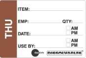 Daydots, a world leader in food safety solutions specializes in products that keep your customers and employees safe from food born illnesses and the prevention of mishaps. Keep foods fresh and prevent spoilage by using Daydots Day of the Week Labels in the refrigerator or freezer that supports food rotation. Place warning signs in the back of the house where slips and falls are most likely to occur and posters to support good personal hygiene practices. Equip your food service establishment with products that are designed to save you time and money.Features:-Dissolvable - Prep Thursday- 2in x 3in size 2" X 3" Dissolvable Prep (E) Thu| Food Safety Solutions - food rotation labels| portion bags| color-coded systems| gloves| thermometers| hygiene| cleaning| and training| Labeling and Rotation| Prep and Handling| Temperature Control| Training and Auditing| Personal Hygiene| Emergency Response| Protective Apparel| Material Handling| Organization| Sanitation and Cleaning| Workplace Maintenance Home