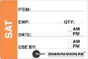 Daydots, a world leader in food safety solutions specializes in products that keep your customers and employees safe from food born illnesses and the prevention of accidents. Keep foods fresh and prevent spoilage by using Daydots Day of the Week Labels in the refrigerator or freezer that supports food rotation. Place warning signs in the back of the house where slips and falls are most likely to occur and posters to support good personal hygiene behavior. Equip your food service establishment with products that are designed to save you time and money.Features:-Dissolvable - Saturday Prep Label- 2in x 3in size labels|food labels|label|kitchen label| 2" X 3" Dissolvable Prep (E/S/F) Sat| Food Safety Solutions - food rotation labels| portion bags| color-coded systems| gloves| thermometers| hygiene| cleaning| and training| Labeling and Rotation| Prep and Handling| Temperature Control| Training and Auditing| Personal Hygiene| Emergency Response| Protective Apparel| Material Handling| Organization| Sanitation and Cleaning| Workplace Maintenance| Daydots Dissolvable Label| 2 in.x3 in.| Saturday 10206-06-31 Home